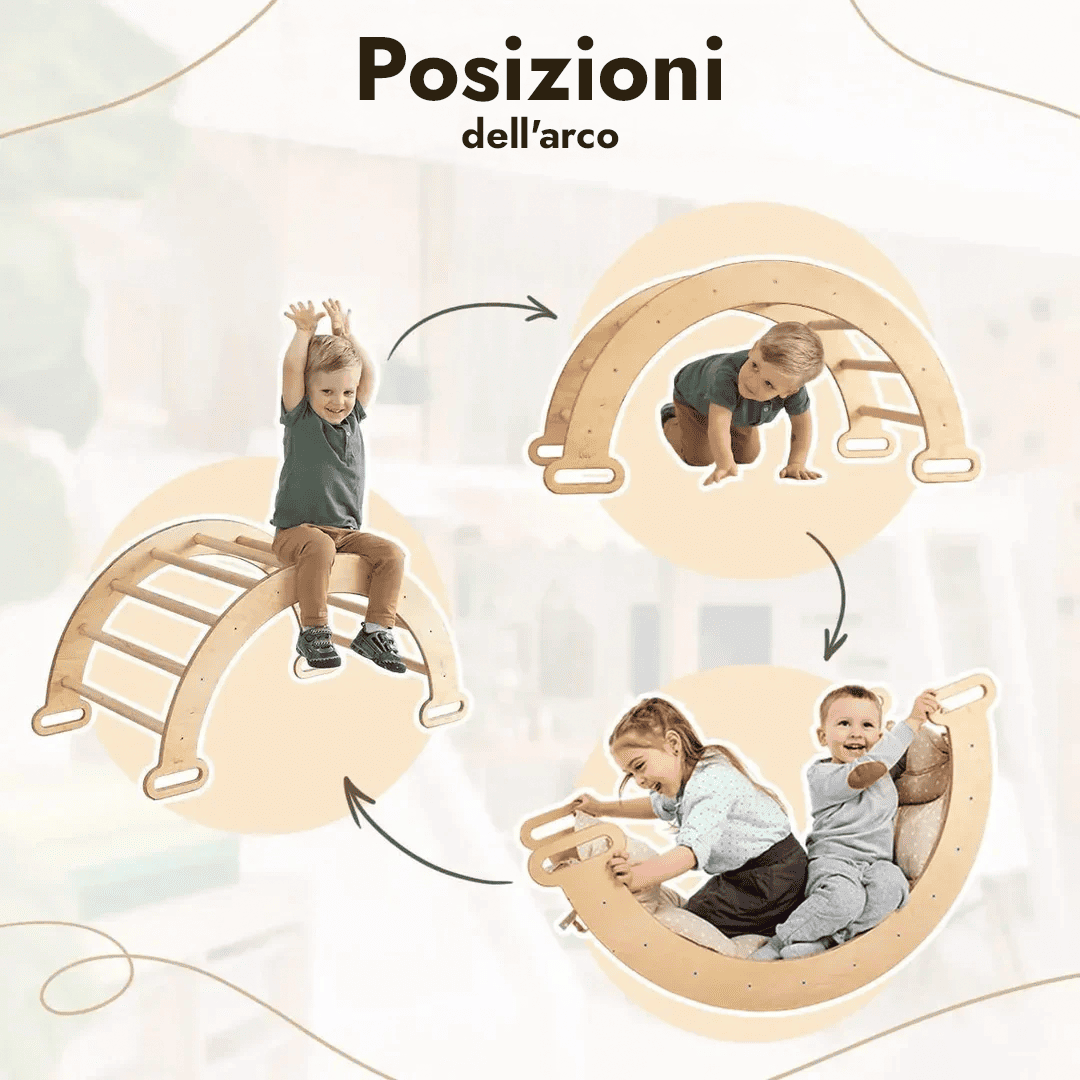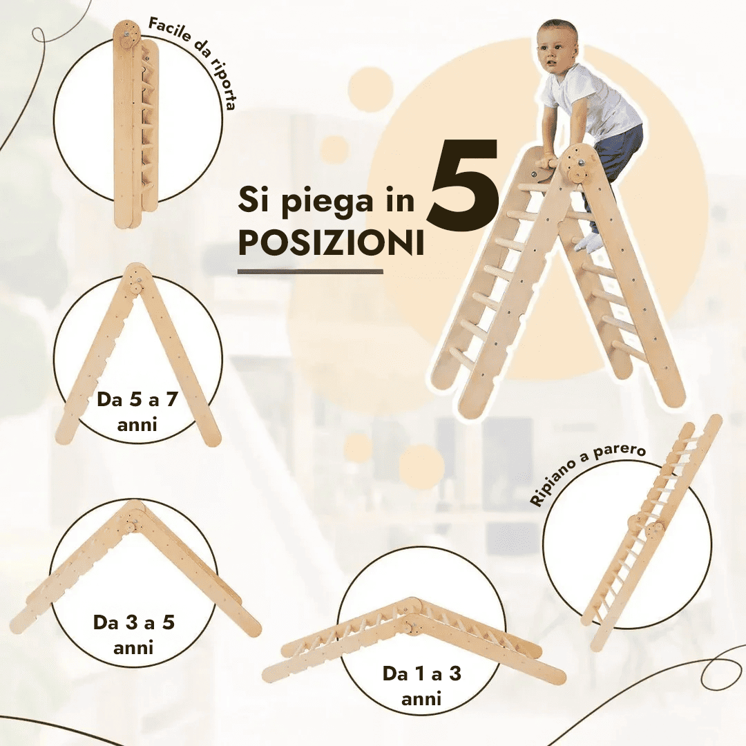 la scala a triangolo funge sia come strumento di allenamento iniziale sia come giocattolo divertente. Con la sua ampia superficie utilizzabile, è particolarmente adatta per bambini dinamici e che possono ospitare due ragazzini che giocano simultaneamente.