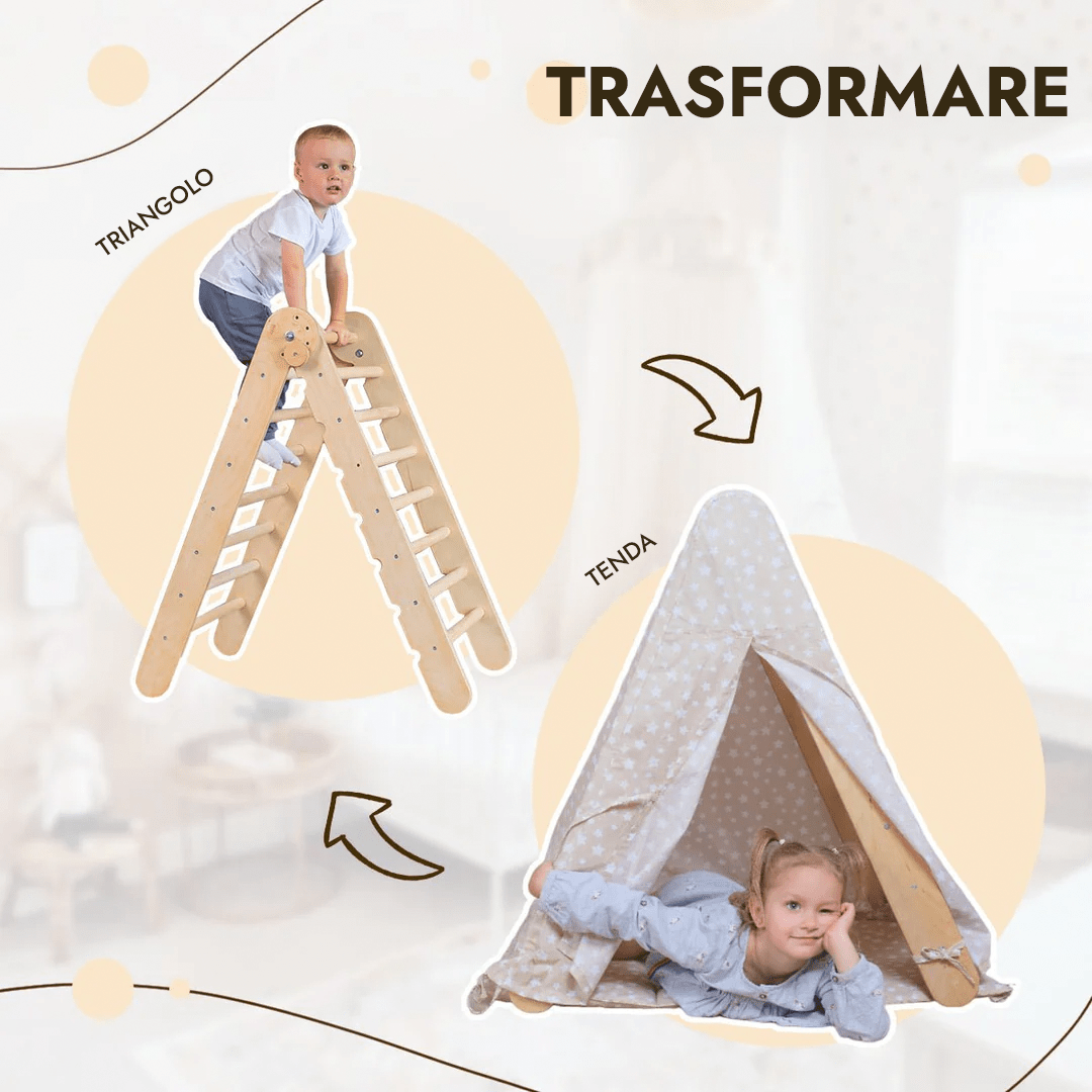 Trasformate la vostra scala a triangolo Montessori in una magica tenda indiana per bambini dove il vostro bambino può giocare, leggere libri, e sviluppare la sua immaginazione. Create conforto e spazio sicuro per il riposo dove il vostro piccolo si sentirà protetto e calmo. In una tale tenda da gioco, il vostro bambino può organizzare la sua zona giochi, formare differenti scenari di gioco, e sviluppare le sue capacità creative e fisiche.
