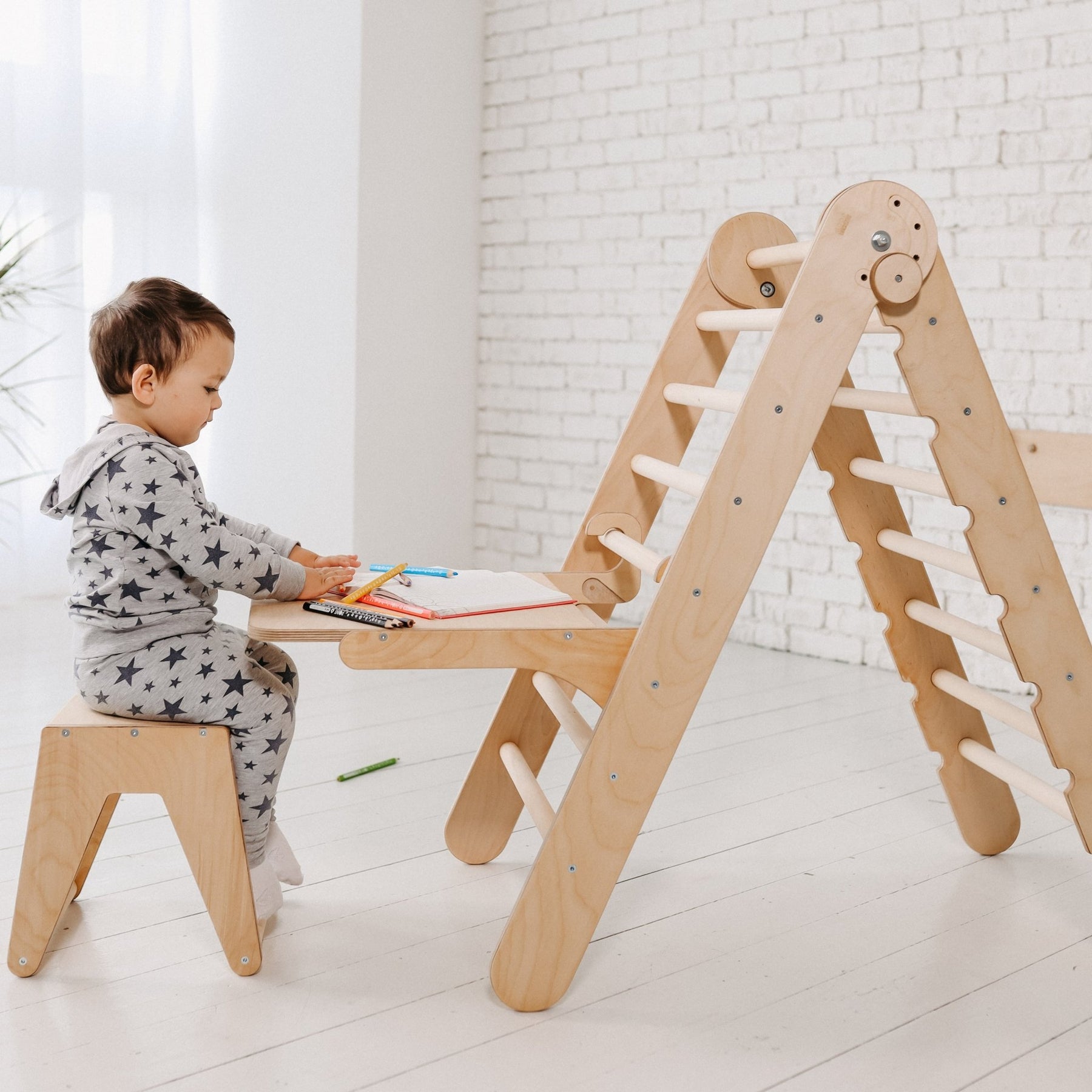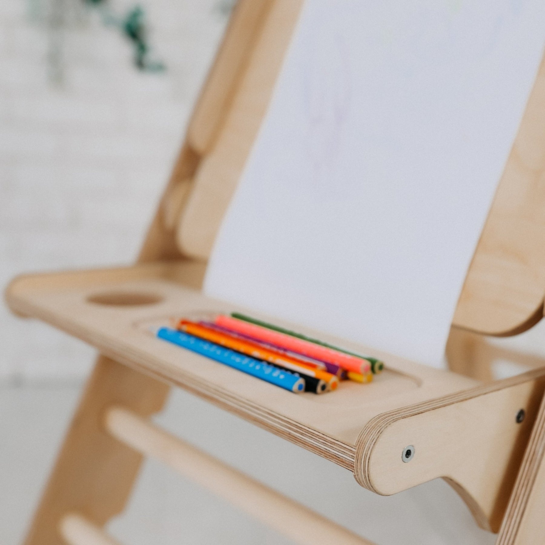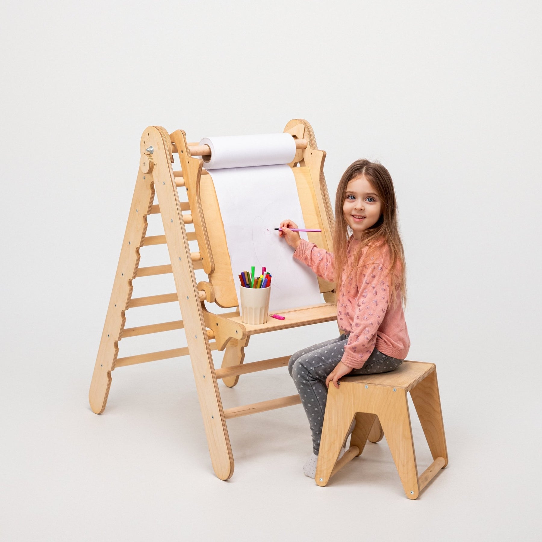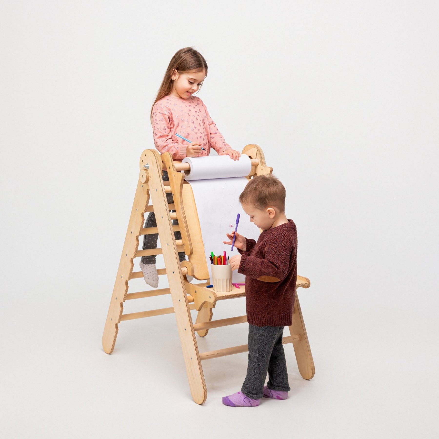 Valorizzate il viaggio creativo del vostro bambino con l’Integrazione Artistica di Goodevas per la Scala a Triangolo. Miscelate perfettamente la funzionalità di un tavolo regolabile con un cavalletto, questa stazione artistica è un paradiso multifunzionale per piccoli artisti. Sia disegnare, scrivere, guardare i cartoni, o giocare, questo allegato si adatta ai bisogni del vostro bambino. Facilmente integrato con la scala a triangolo Goodevas, questa stazione artistica promuove la flessibilità permettendovi di riposizionarla facilmente intorno alla vostra casa. Semplicemente impostatelo all’altezza desiderata, ed è pronto da usare. Inoltre, quando è abbinato ad una parete da arrampicata, si trasforma in uno spazio artistico omnicomprensivo.