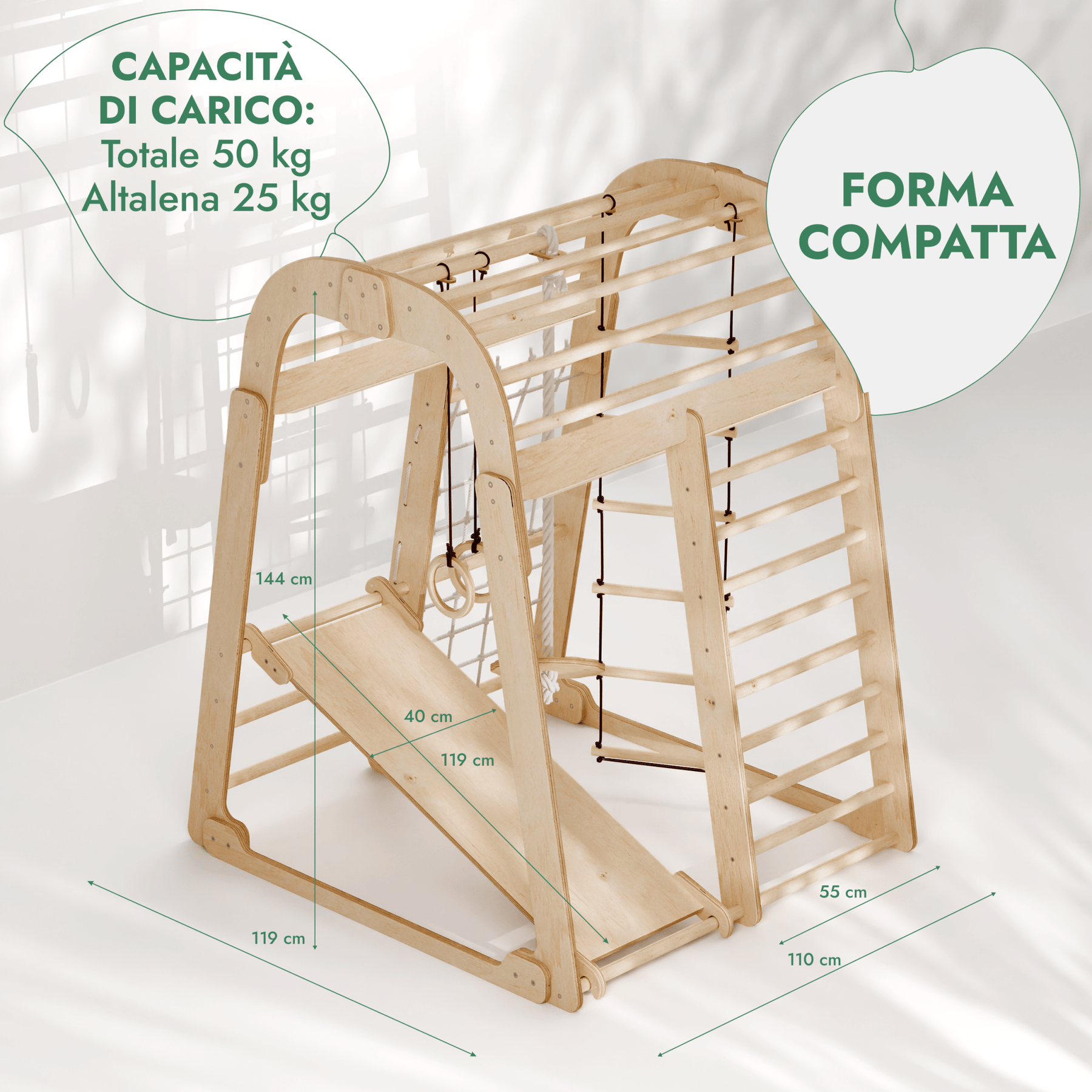 • Parco Giochi 6 in 1 per Interni in Legno – Scivolo e Set di Altalene Inclusi Kit di installazione