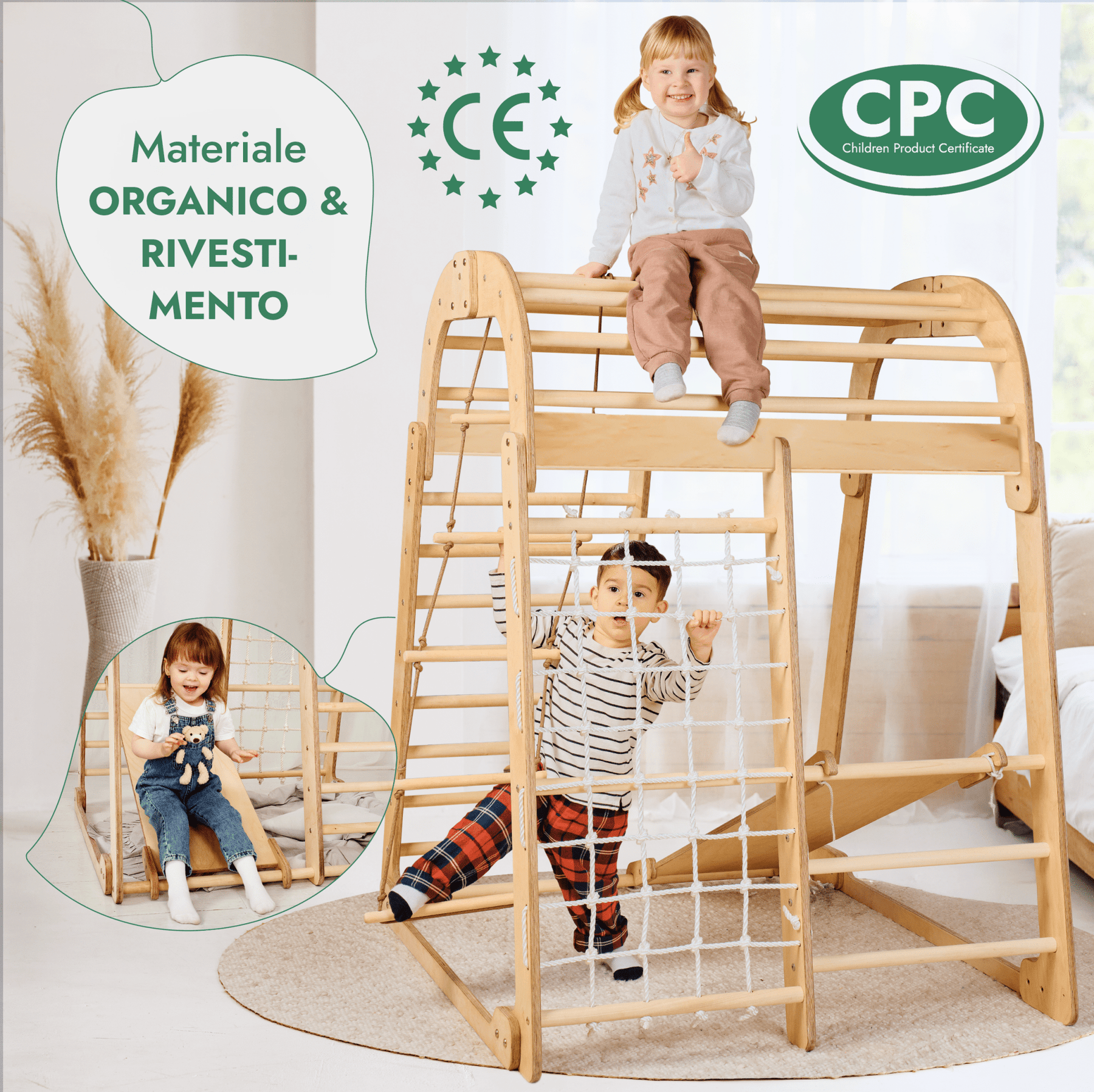 Presentazione dell’Area Gioco Bambini, una struttura da arrampicata multifunzionale realizzata meticolosamente ispirata all’approccio Montessori. Progettata per bambini dai 3 agli 8 anni, questa area gioco consente ai giovani esploratori di perfezionare le abilità come l’equilibrio, il coordinamento e le capacità motorie - tutte nello spirito del divertimento! La struttura vanta: