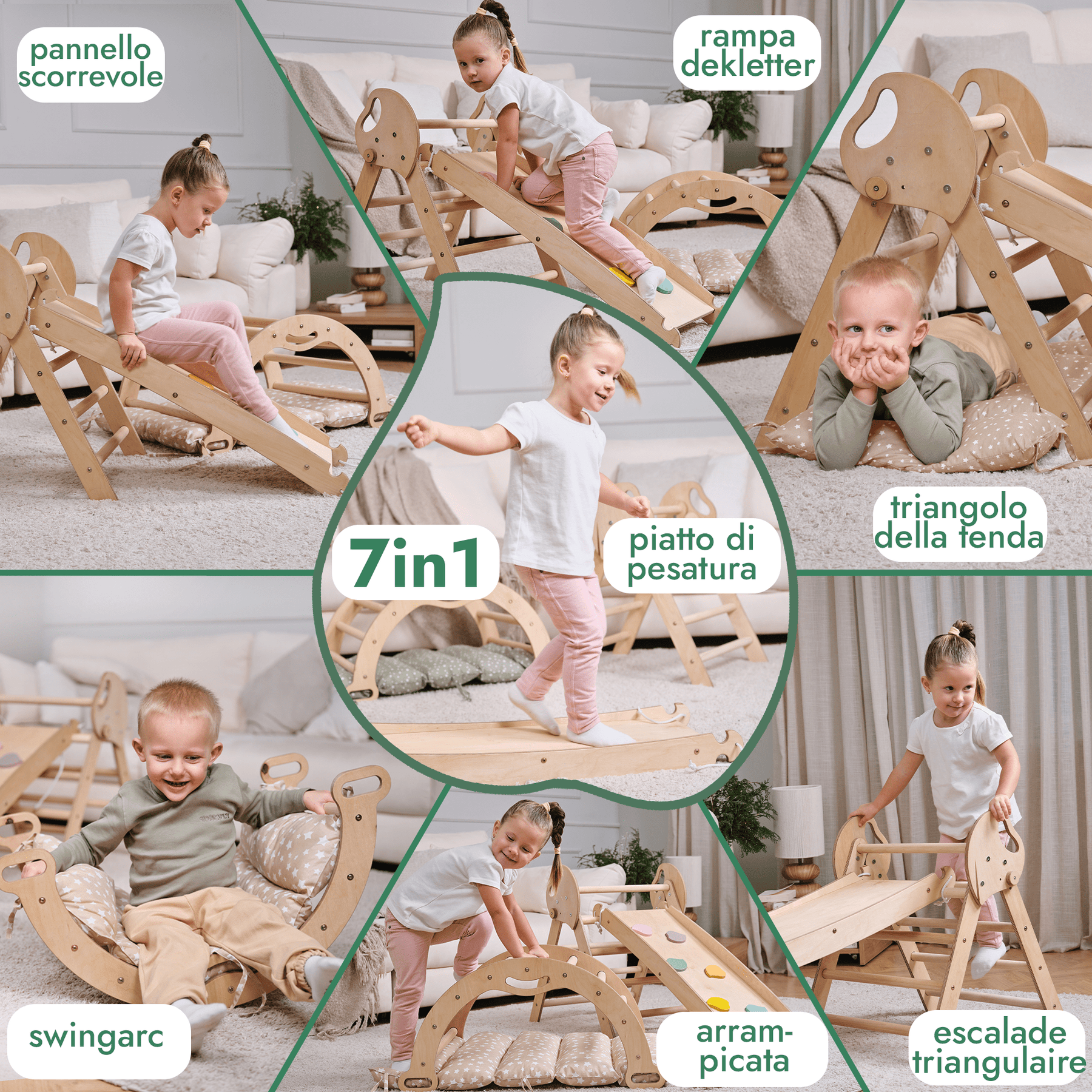 Un giocattolo multifunzionale che funge sia da arco da arrampicata che da dondolo, incoraggiando diversi scenari di gioco e stimolando l'immaginazione.