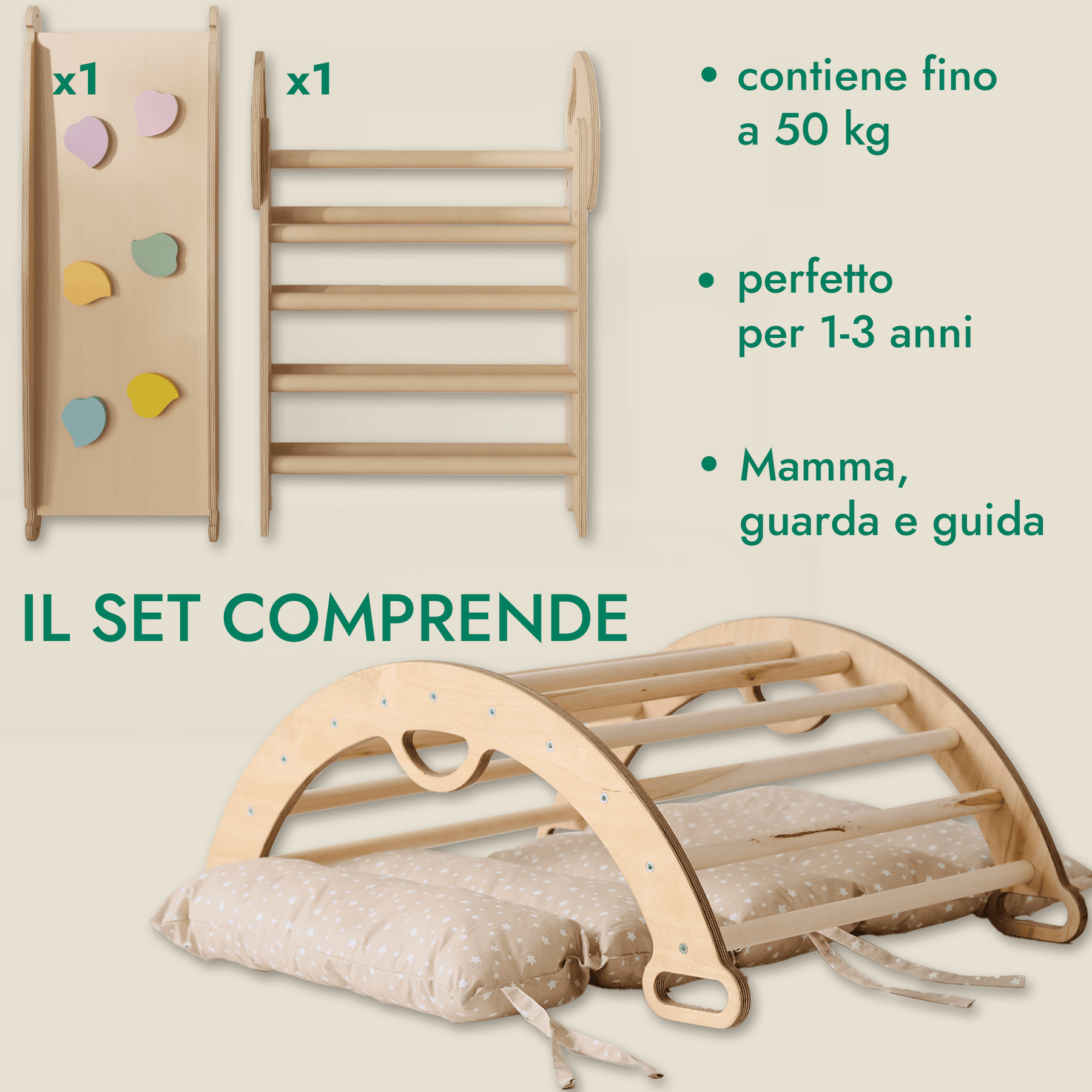 Il triangolo è un elemento fondamentale del set, progettato per favorire il rafforzamento muscolare, l'equilibrio e lo sviluppo delle abilità motorie. Il set del triangolo Pikler è ideale per l'arrampicata indipendente e l'esplorazione.