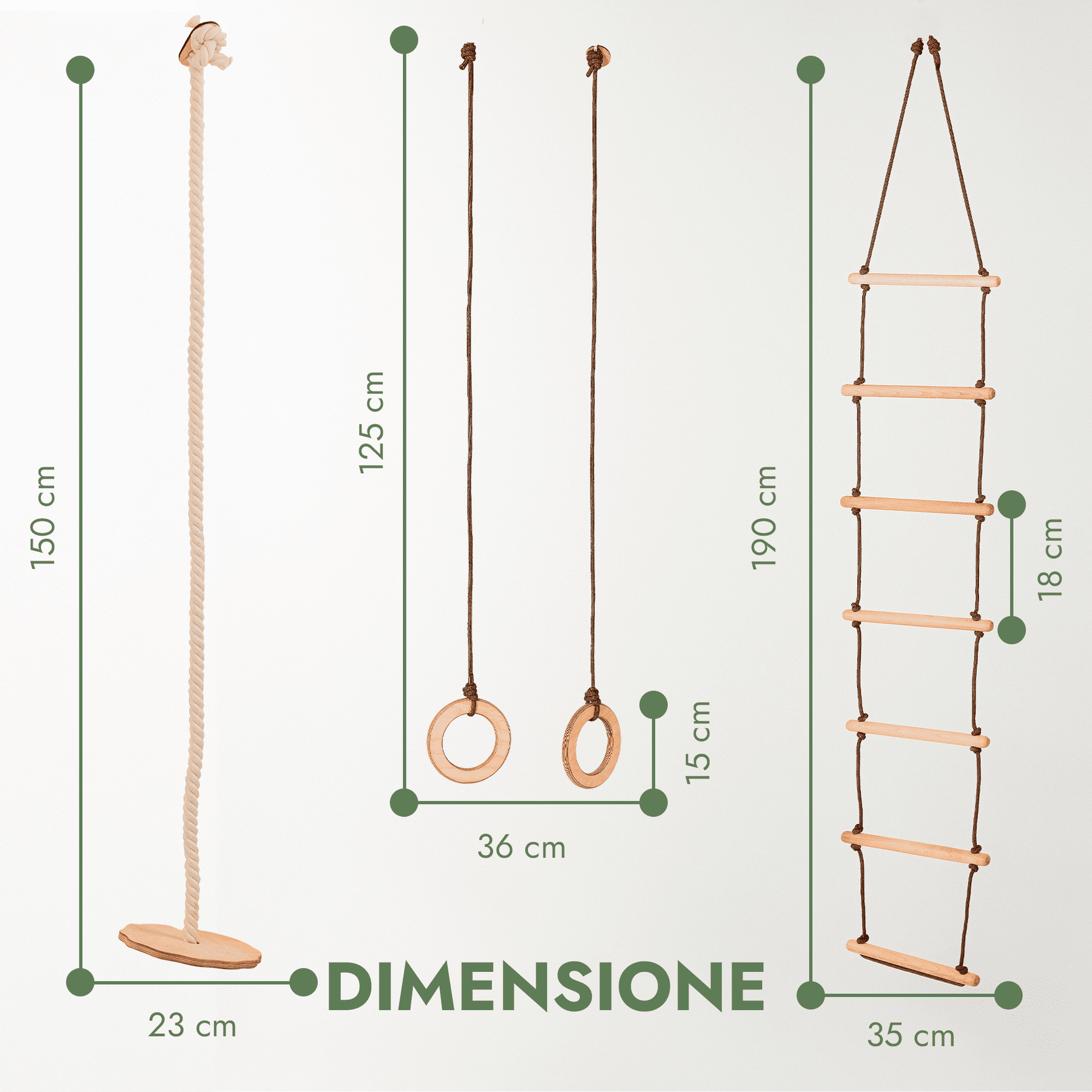 Valorizzate lo sviluppo fisico e mentale del vostro bambino con il nostro set versatile a tre dondoli. Perfetto per ambienti sia interni che esterni, questo set fornisce una gamma completa di attività. Da dondolarsi a arrampicarsi, stimola il coraggio, l’indipendenza, il controllo dell’equilibrio, e le capacità grosso motorie. Oltre ai benefici fisici, stimola anche la giovane mente insegnando ai bambini come interagiscono componenti diversi aprendo la strada per loro per raggiungere nuovi traguardi.
