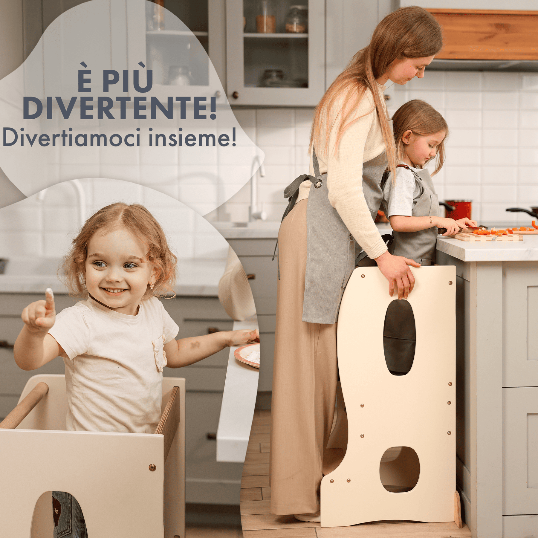 La nostra Torre Montessori è la soluzione perfetta per bambini di età da 1 a 7 anni, che permette loro di partecipare attivamente alle attività quotidiane di famiglia. Con questa torre, il vostro piccolo può aiutare in cucina, lavarsi le mani nel lavandino, pulire insieme a voi, e impegnarsi in altre mansioni che sono fuori dalla sua portata.