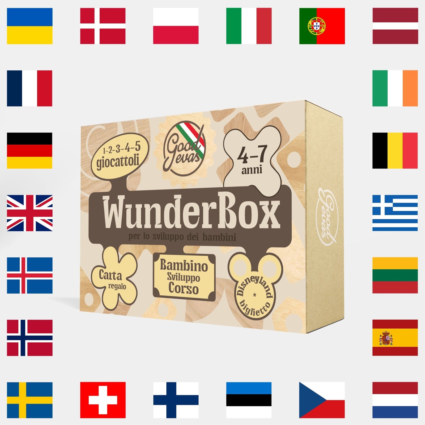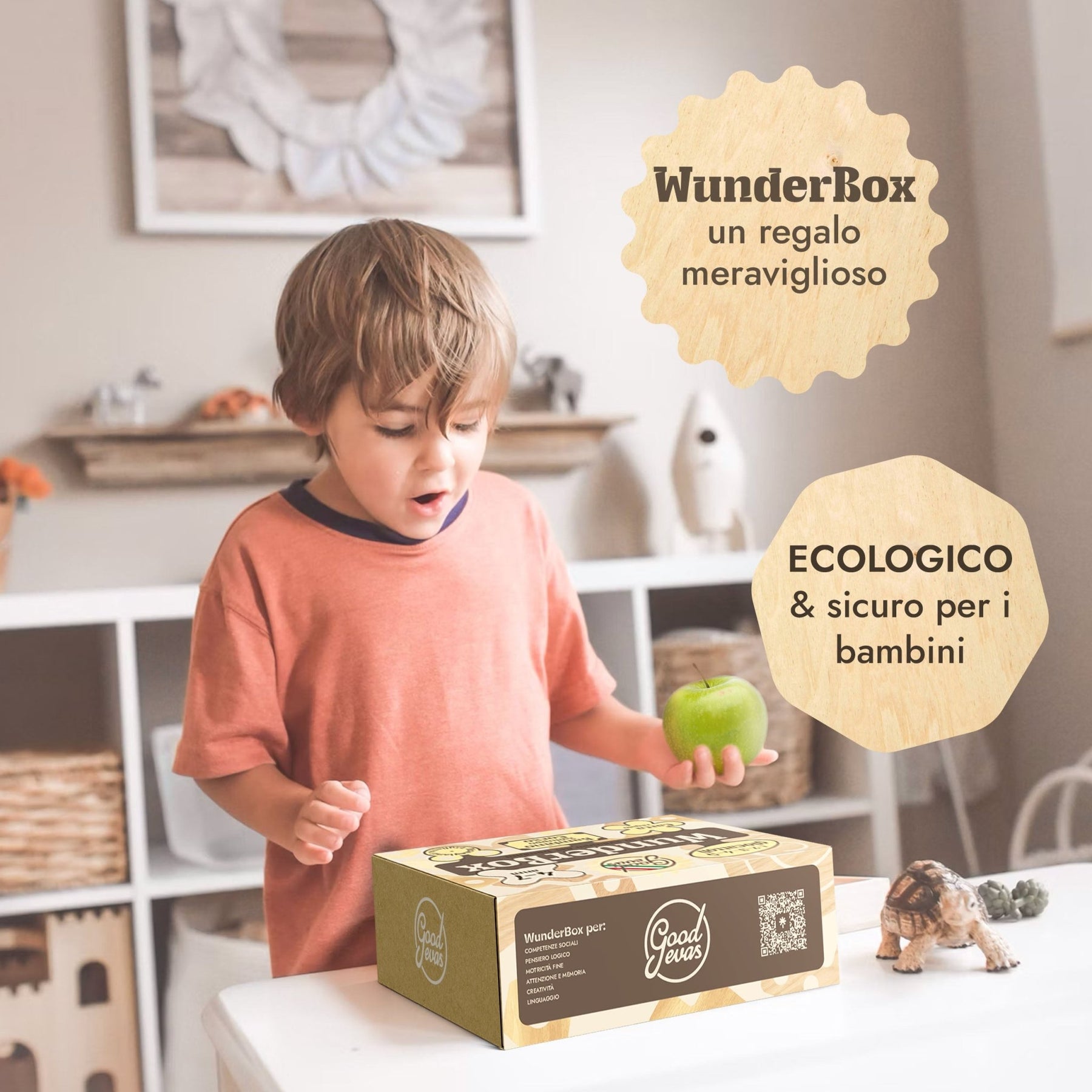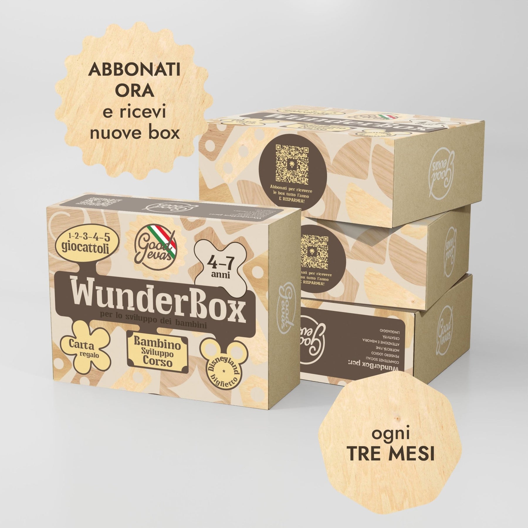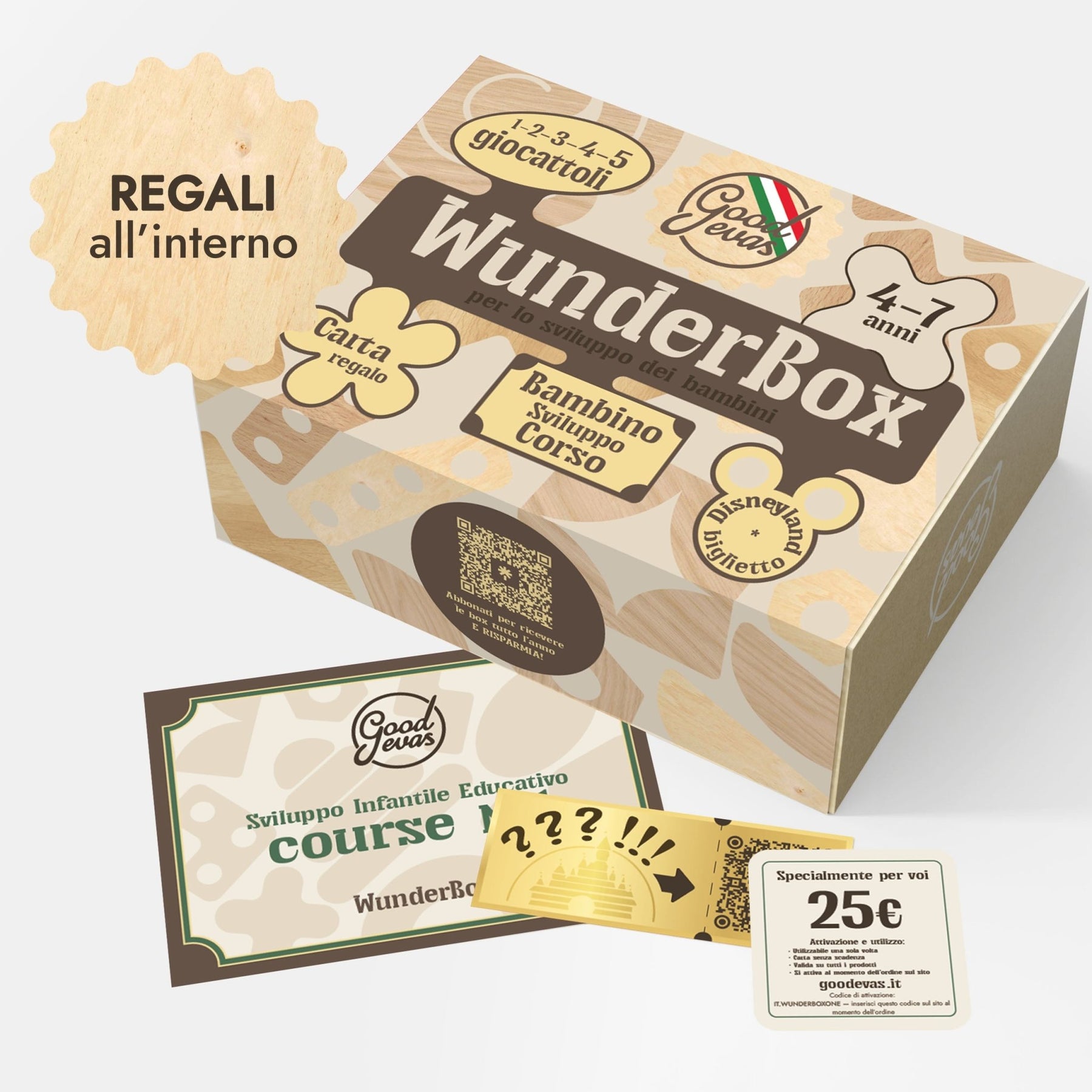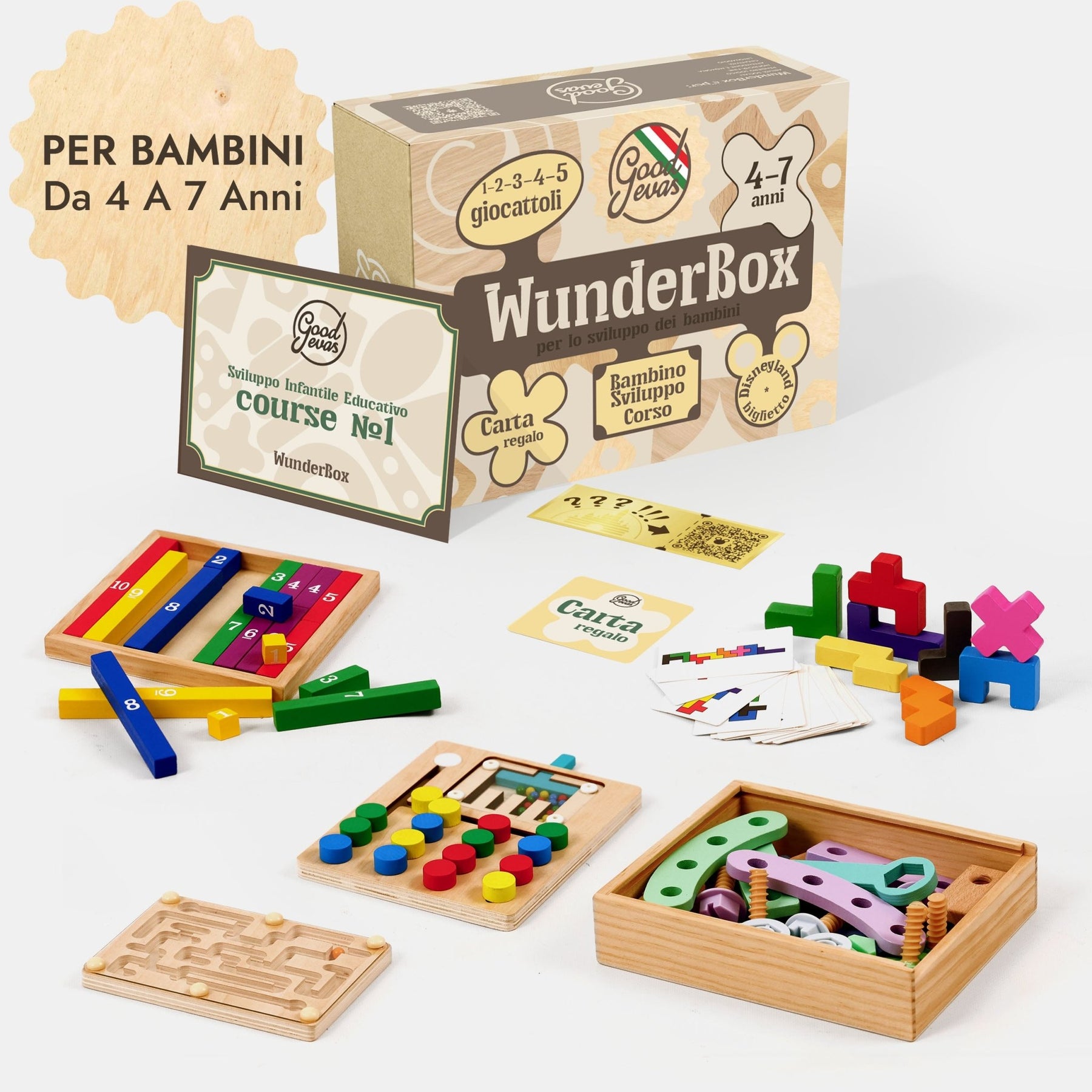 Un kit educativo pensato in base all’età e alle esigenze del tuo bambino.Ogni box contiene giochi selezionati con cura per stimolare lo sviluppo, un videocorso esclusivo per i genitori ispirato al metodo Montessori, una carta sconto per i prodotti Goodevas e la partecipazione automatica all’estrazione per vincere un viaggio a Disneyland.
